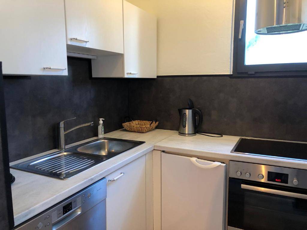 Volledig ingerichte keuken met oven en magnetron, woonkamer, aparte toilet en boven een douche met wastafel en toilet.